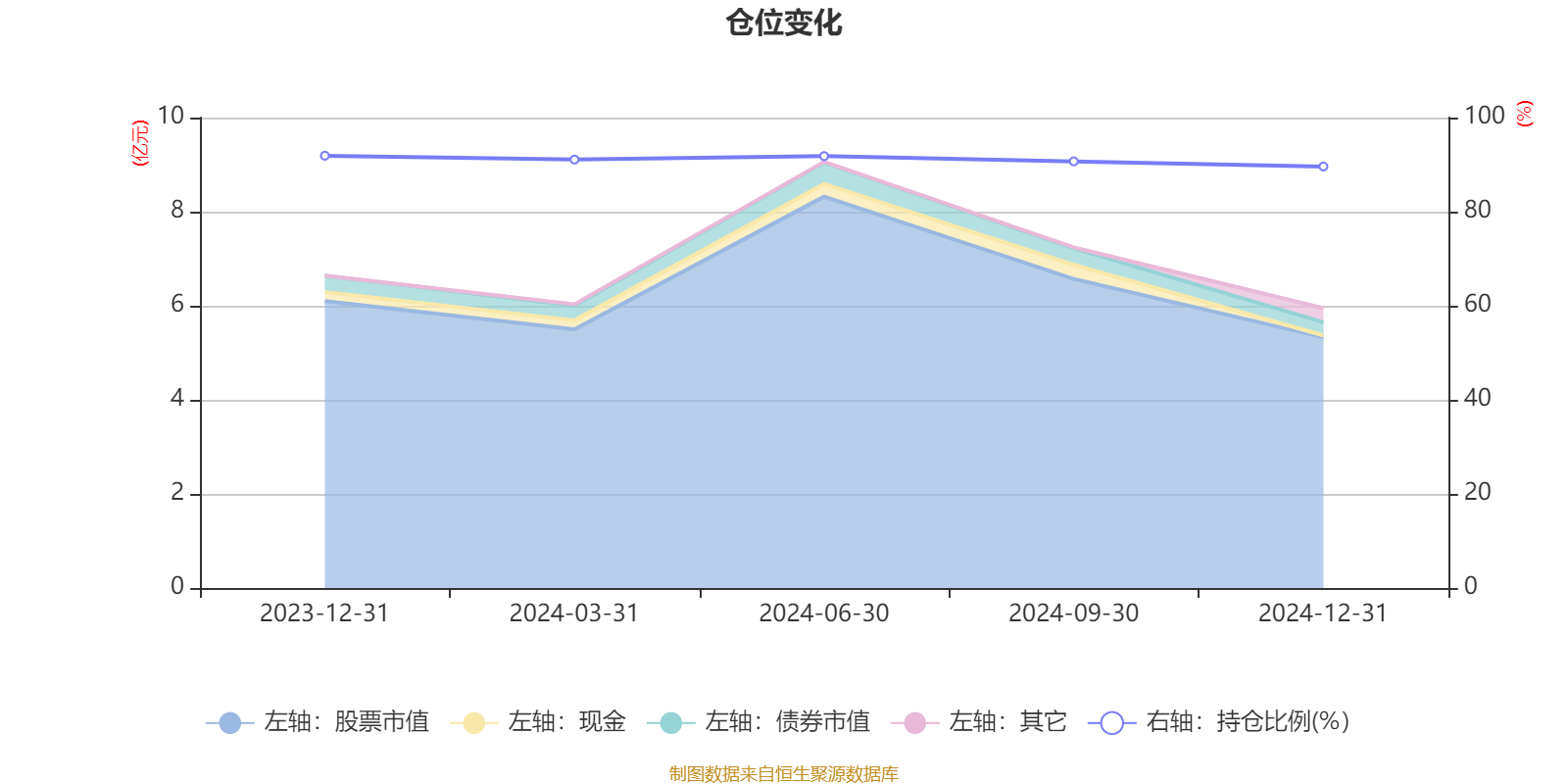 据定期报告数据统计,成立以来平均股票仓位为91.02%,同类平均为88.02%。2023年末基金达到91.9%的最高仓位,2024年末最低,为89.6%。
